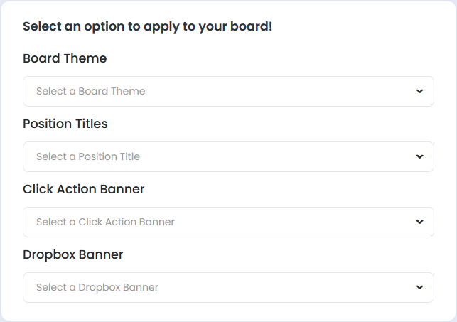 Any selection you make from one of the dropdowns will automatically be applied to your board in-world!